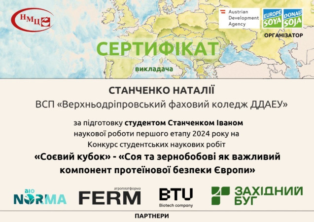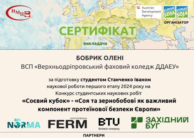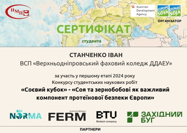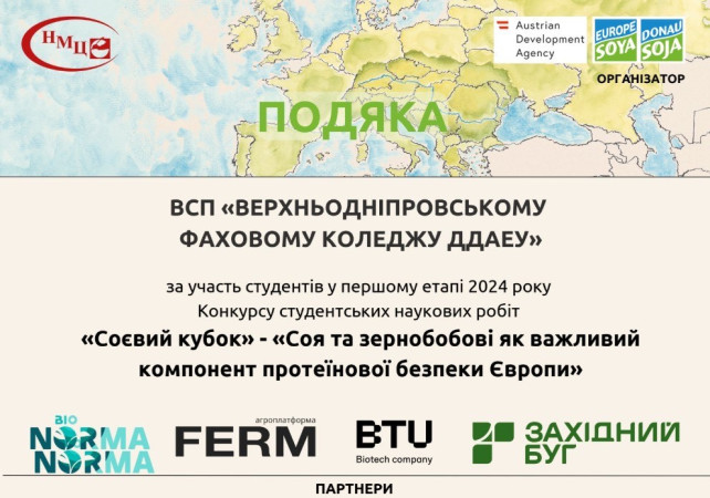 Дослідження «Ринок сої та бобових в ЄС» продемонструвало сучасний підхід до вирішення актуальних питань аграрної науки та стало яскравим прикладом наполегливості, креативності та аналітичного мислення! Дякуємо організаторам конкурсу: • Асоціації «Дунайська Соя» • ДУ «Науково-методичний центр вищої та фахової передвищої освіти» • Партнерам: BTU, BioNorma, ПП «Західний Буг» і Ferm.